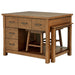 Designed with everyday flexibility in mind, this kitchen island combines storage, seating, and workspace in a single, streamlined footprint. Ten drawers with dark grey pulls keep utensils and tools close at hand, while a spacious open shelf adds room for bulkier items. A pull-out extension table slides smoothly from the side, transforming the island into a meal prep zone or dining spot. Two backless stools store discreetly underneath on built-in stemware-style supports, blending function with rustic charm in a warm dark oak finish. Key Features: • Kitchen island features a pull-out extension table for additional prep or dining space • Ten drawers with metal handles provide convenient enclosed storage for kitchen tools • Two backless stools stow neatly beneath on integrated stemware-style storage rails • Warm dark oak finish enhances wood grain and adds rustic character to the design • Crafted from solid rubberwood, engineered wood, and oak veneer for daily durability • Open lower shelf offers flexible storage for cookware, baskets, or larger kitchen items