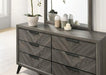 The diagonal replicated grain meet at the center line, forming a V-shaped pattern found on the front panels. Contemporary elements continue throughout this ensemble, with the black angled legs and sleek finger pulls found on the matching case goods. Coordinating pieces like this set offer a stress-free experience in updating your bedroom decor.