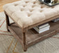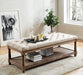 Tanya Beige Bench, 48"L X 15 3/4"W 18 1/2"H, 66.22lbs. The perfect bench for a living room or an entryway where you want to make a quick stop. The worn wood look adds that touch of country charm, like a nice place to kick o Features: Button Tufted Seat Open Bottom Shelf