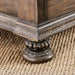 Luxury and style blends together to make this beautiful contemporary sleigh bedroom set. The fabric padded headboard and footboard provide warm comfort and paired button tufted details offer an extravagant finish. Case goods feature antique handles and the rustic natural wood finish creates a soothing bedroom environment. Make your sleeping area feel like a luxurious getaway with this extraordinary bedroom set!