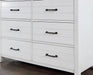 This unique two-tone dresser is perfect for a young child. The front panels all feature slat designs, which combined with the black metal bar handles offer a bit of Mission style flair. The striking contrast between the gray tops and edges and white frames updates this dresser into more of a contemporary look.